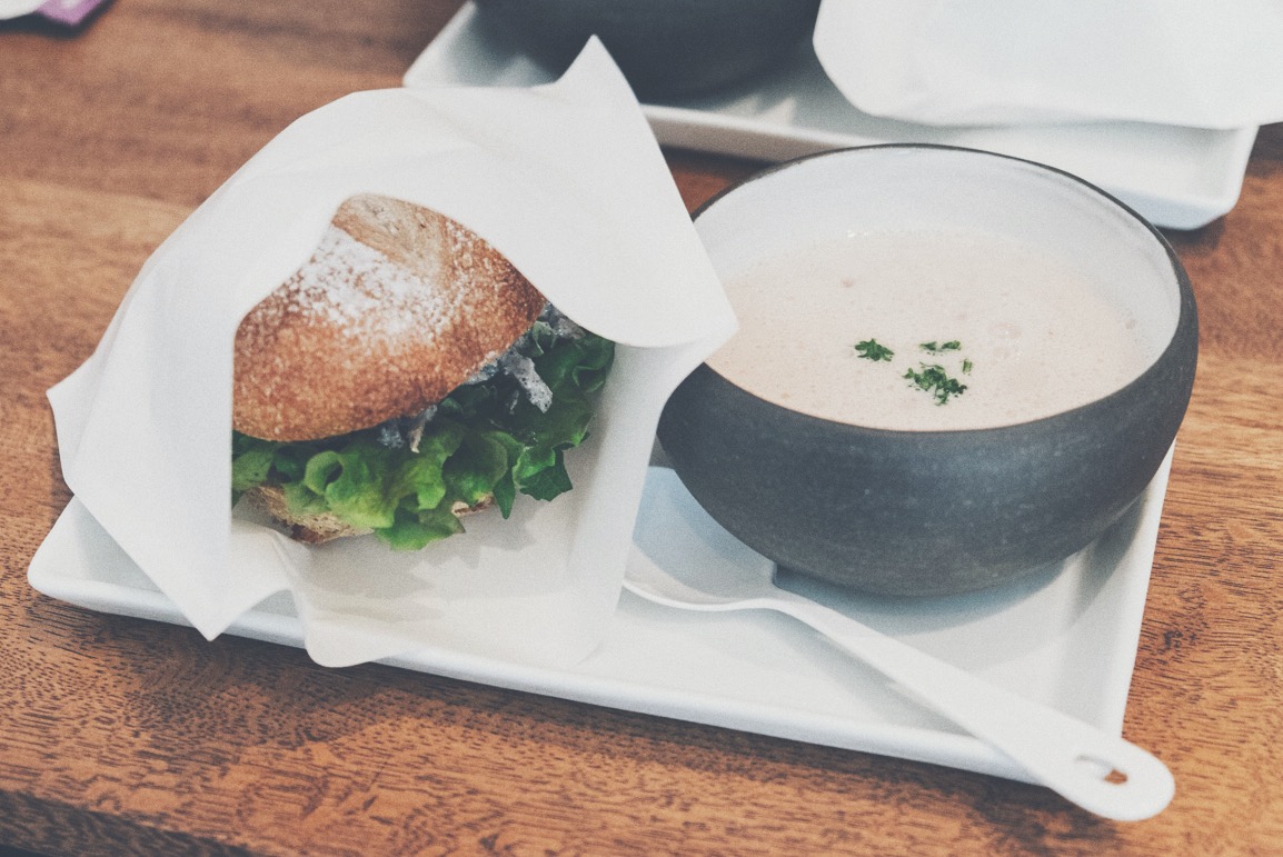 こちらは先日いただいたコボウのサラダサンドとジャガ芋の豆乳ポタージュ。